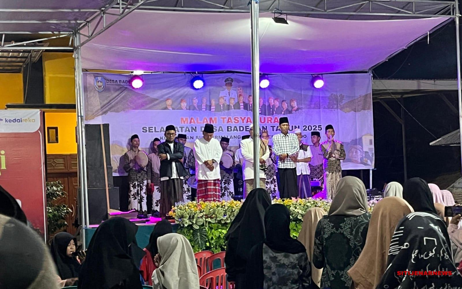 Pada malam harinya, suasana desa menjadi khidmat. Seluruh warga berkumpul dalam kegiatan tasyakuran Selamatan Desa, yaitu pengiriman doa kepada para leluhur serta memohon perlindungan, kelimpahan hasil pertanian, dan keselamatan hidup. Doa-doa ini dipanjatkan dengan kesungguhan, mencerminkan hubungan erat antara manusia, alam, dan Tuhan yang menjadi pusat kehidupan masyarakat agraris seperti Desa Baderan.