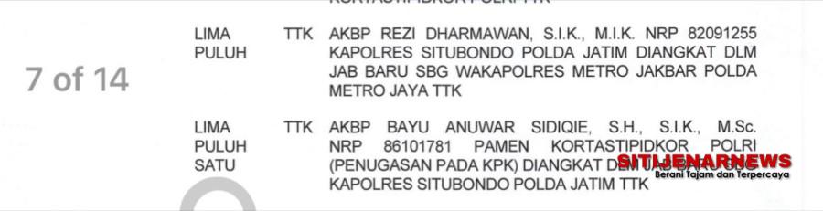 Pergantian pucuk pimpinan tersebut tertuang dalam Surat Telegram Kapolri Nomor: ST/2781A/XII/KEP./2025 yang diterbitkan pada 15 Desember 2025. Dalam surat tersebut, AKBP Rezi Dharmawan, S.I.K., M.I.K., yang telah menjabat sebagai Kapolres Situbondo selama kurang lebih dua tahun, resmi dimutasi dan mendapatkan promosi jabatan sebagai Wakil Kepala Polres Metro Jakarta Barat, Polda Metro Jaya.