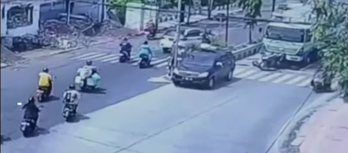 Setelah melintas di traffick light, sopir tronton hilang kendali dan langsung menabrak dua pemotor dan mobil Innova yang sedang berhenti menunggu lampu hijau nyala.