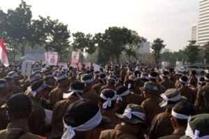 Sitijenarnews.com Jakarta Rabu 18 Mei 2022; Ribuan massa karyawan Perum Perhutani se-pulau Jawa dan Madura berunjuk rasa di Kawasan Patung Arjuna Wijaya atau Patung Kuda, Jakarta Pusat pada pagi ini Rabu (18/5/2022).