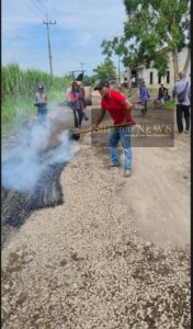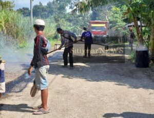 Sitijenarnews.com Panarukan Situbondo Jatim Sabtu 28 Mei 2022; PT BANYU BIRU KAHURANGI menggandeng CAK NONO dan beberapa elemen warga desa duwet hari ini melakukan Giat pengaspalan di beberapa titik jalan desa di wilayah Kec.panarukan Kabupaten Situbondo.