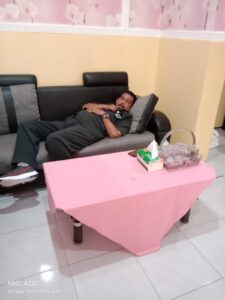 Saat itu pria bertubuh sedang tidak gemuk tidak kurus ini ketahuan tertidur diruang tamu (loby) tergeletak lemas di antara Staf stafnya yang mengetahui tidak berani membangunkan walau ada tamu juga yang berkepentingan dengan beliau