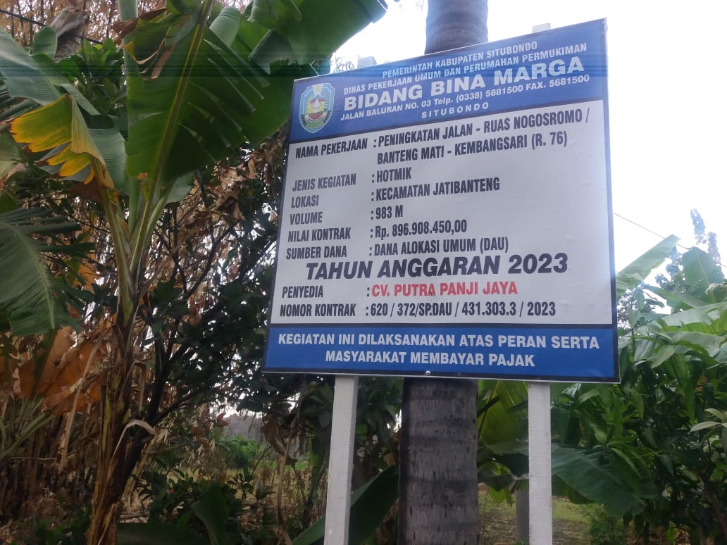 Selain itu pekerjaan CV Putra panji jaya yang bertempat diwilayah jatibanteng, dan jenis pekerjaan Hotmik dan kisaran 983 M. Dan kontarak Kerja senilai 896.908.450,00. Dari sumber Dana Alokasi Umum (DAU) dan yang Seharunya menjadi contoh yang sudah tertera di papan Nama.