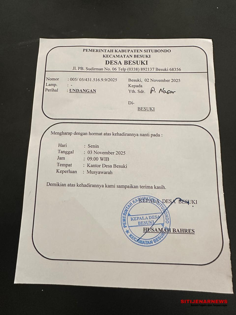 Keterangan fhoto: Surat Undangan mediasi Di Balai Desa Besuki Pada Senin 3 November 2025 Lalu.