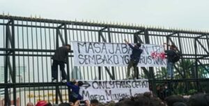 Sitijenarnews,Com Jakarta Senin 11 April 2022; Ribuan masa ricuh usai menerima Pimpinan DPR RI menemui massa mahasiswa yang menggelar demo di depan gedung MPR/DPR, Senayan, Jakarta. Kapolri Jenderal Listyo Sigit Prabowo juga hadir bersama rombongan pimpinan DPR RI.